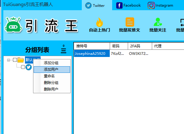 TGS引流王自动添加登录推特账户1.首先打开软件,选中分组,点击右键,选择添加账户09:442.按照格式添加,第1个是推特号,第2个是密码,第3个是2FA码,然后分隔线按照默认的或自定义的就可以,如果...