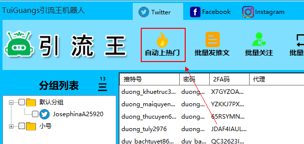 如何使用Twitter推特引流王自动上热门1.首先打开软件登录好我们的推特账号,然后点击【自动上热门】按钮2.首先选择上热门的账号,设置发推的内容,可以发文字&图片,如果不发图片的话【图片和视...